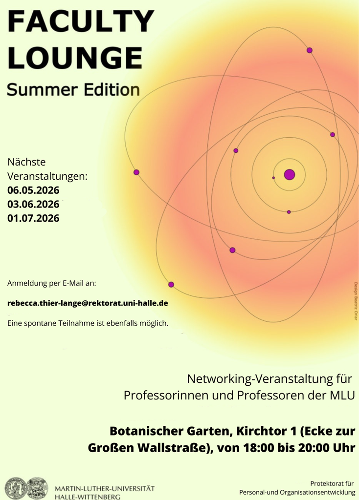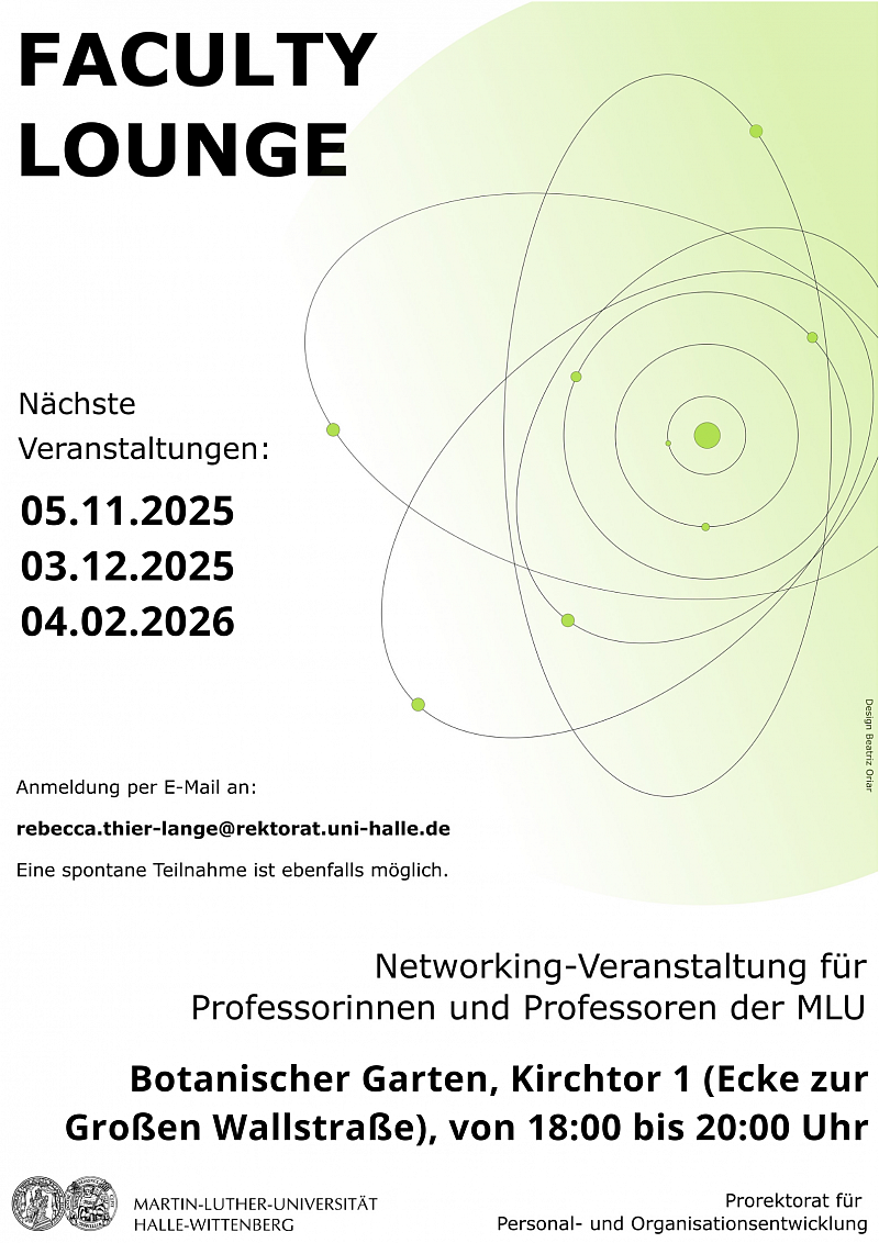 Die MLU Faculty Lounge bietet Professorinnen und Professoren der Martin-Luther-Universität Halle-Wittenberg seit November 2022 die Möglichkeit, sich regelmäßig in entspannter Atmosphäre auszutauschen sowie Netzwerke mit MLU Kolleginnen und Kollegen über Fakultäten hinweg aufzubauen und zu pflegen. Die Idee zur MLU Faculty Lounge kam der Personalentwicklungskommission, die in ihr auch ein Instrument für die Integration Neuberufener sieht. Sie findet jeden ersten Mittwoch im Monat während der Vorlesungszeit von 18-20 Uhr statt.